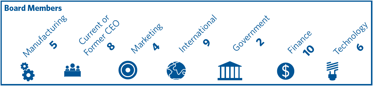 Because Ford is a large and complex company, the Nominating and Governance Committee considers numerous qualifications when considering candidates for the Board. In addition to the qualifications listed below, among the most important qualities directors should possess are the highest personal and professional ethical standards, integrity, and values. They should be committed to representing the long-term interests of all shareholders. Directors must also have practical wisdom and mature judgment. Directors must be objective and inquisitive. Ford recognizes the value of diversity, and we endeavor to have a diverse Board, with experience in business, international operations, finance, manufacturing and product development, marketing and sales, government, education, technology, and in areas that are relevant to the Company's global activities. The biographies of the nominees show that, taken as a whole, the current slate of director nominees possesses these qualifications. Directors must be willing to devote sufficient time to carrying out their duties and responsibilities effectively, including making themselves available for consultation outside of regularly scheduled Board meetings, and should be committed to serve on the Board for an extended period of time. Directors should also be prepared to offer their resignation in the event of any significant change in their personal circumstances that could affect the discharge of their responsibilities as directors of the Company, including a change in their principal job responsibilities. Each of the nominees for director is now a member of the Board of Directors, which met eight times during 2017. Each of the nominees for director attended at least 75% of the combined Board and committee meetings held during the periods served by such nominee in 2017. The nominees provided the following information about themselves as of the latest practical date. Additionally, for each director nominee we have disclosed the particular experience, qualifications, attributes, or skills that led the Board to conclude that the nominee supports the Company’s strategy and thus, should serve as a director. Manufacturing