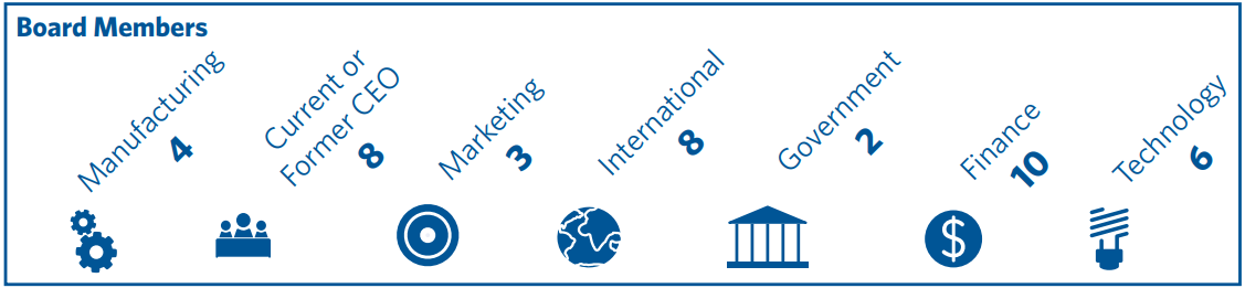 Because Ford is a large and complex company, the Nominating and Governance Committee considers numerous qualifications when considering candidates for the Board. In addition to the qualifications listed below, among the most important qualities directors should possess are the highest personal and professional ethical standards, integrity, and values. They should be committed to representing the long-term interests of all shareholders. Directors must also have practical wisdom and mature judgment. Directors must be objective and inquisitive. Ford recognizes the value of diversity, and we endeavor to have a diverse Board, with experience in business, international operations, finance, manufacturing and product development, marketing and sales, government, education, technology, and in areas that are relevant to the Company’s global activities. The biographies of the nominees show that, taken as a whole, the current slate of director nominees possesses these qualifications. Directors must be willing to devote sufficient time to carrying out their duties and responsibilities effectively, including making themselves available for consultation outside of regularly scheduled Board meetings, and should be committed to serve on the Board for an extended period of time. Directors should also be prepared to offer their resignation in the event of any significant change in their personal circumstances that could affect the discharge of their responsibilities as directors of the Company, including a change in their principal job responsibilities. Each of the nominees for director is now a member of the Board of Directors, which met nine times during 2018. Each of the nominees for director attended at least 75% of the combined Board and committee meetings held during the periods served by such nominee in 2018. The nominees provided the following information about themselves as of the latest practical date. Additionally, for each director nominee we have disclosed the particular experience, qualifications, attributes, or skills that led the Board to conclude that the nominee supports the Company’s strategy and thus, should serve as a director. Manufacturing